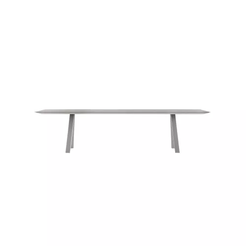 Tafel met stevige stalen bokpoten en een blad dat wordt ondersteund door een frame van geëxtrudeerd aluminium. De combinatie van materialen biedt zowel stevigheid als een strakke industriële uitstraling.