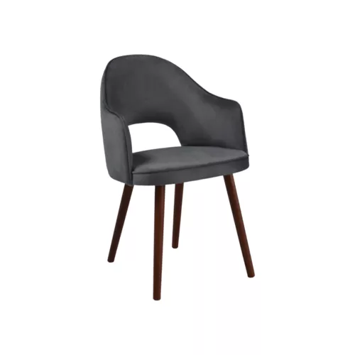 Bistra A Gap is a stylish upholstered chair with armrests and a distinctive cutout back, blending comfort with contemporary aesthetics. Crafted with sturdy beech wood legs, available in several stain options, and upholstered in durable fabrics or faux leather, it adapts easily to a variety of horeca spaces and interior styles.
