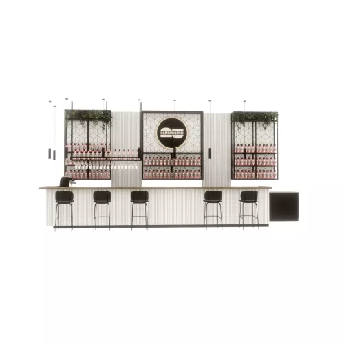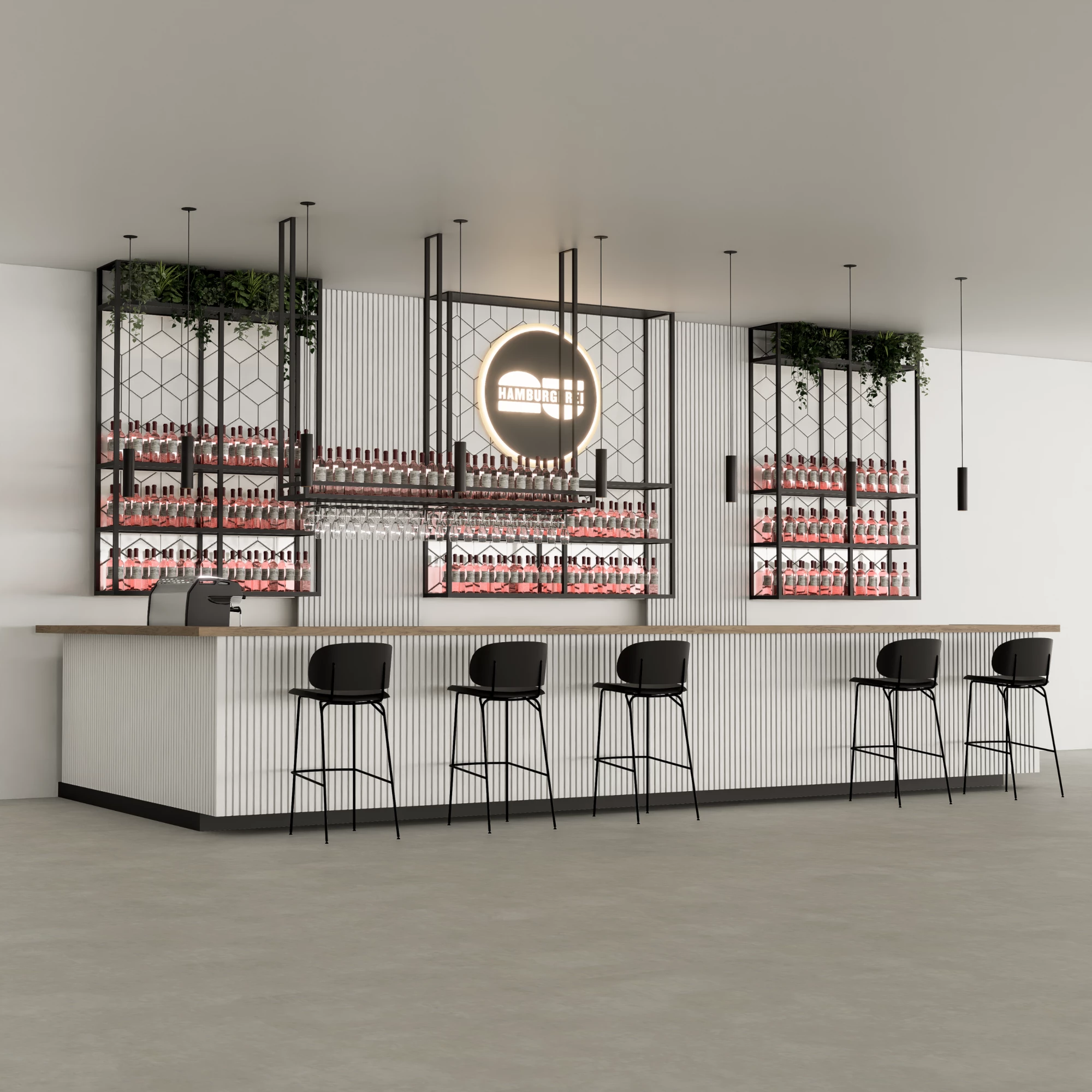 Deze bar combineert natuurlijke materialen, moderne texturen en architectonische stalen details tot een strak, eigentijds middelpunt dat past in elk stijlvol horeca-interieur.