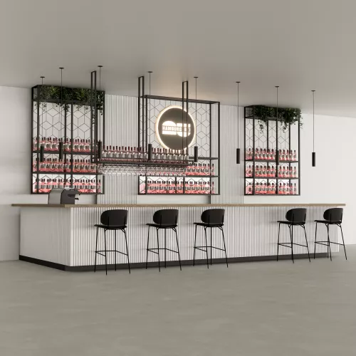 Een fris en eigentijds barconcept met strakke lijnen, natuurlijke warmte en sculpturale texturen.