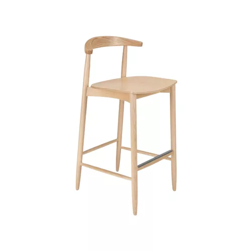 Verfijnde barkruk gemaakt van massief beukenhout, met elegant taps toelopende poten en een gebogen rugleuning die de natuurlijke houtnerf prachtig accentueert. De voetensteun van geborsteld roestvrij staal voegt een eigentijdse touch toe en garandeert duurzaamheid en comfort. Afgerond met een bijpassende houten zitting, belichaamt dit meubelstuk tijdloos design en solide vakmanschap — ideaal voor stijlvolle horeca-interieurs.