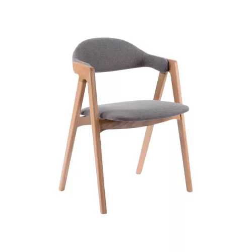 Introduce a blend of modern elegance and comfort to your dining area with this oak frame restaurant chair. The chair features a finely crafted oak wooden frame, ensuring both durability and a natural, warm aesthetic. The seat and backrest are upholstered in a high-quality grey fabric, providing a comfortable and sophisticated seating experience.