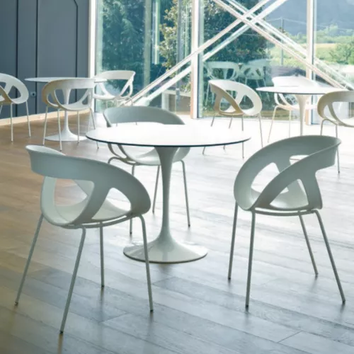 De Moerra stoel heeft een duurzame technopolymeer kuip, die zowel comfort als duurzaamheid biedt. Het onderstel is gemaakt van een standaard gelamineerd oppervlak in natuurlijk beukenhout (F - natuurlijk beuken) of natuurlijk eikenhout (RN - natuurlijk eiken), wat zorgt voor een natuurlijke en tijdloze uitstraling. De kuip is verkrijgbaar in verschillende levendige kleuren, waaronder wit, beige, rood, zwart, grijs, oranje, bruin en appelgroen. Let op: Deze stoel wordt niet gemonteerd geleverd en moet vóór gebruik worden gemonteerd, waardoor de levering en verwerking flexibel zijn.