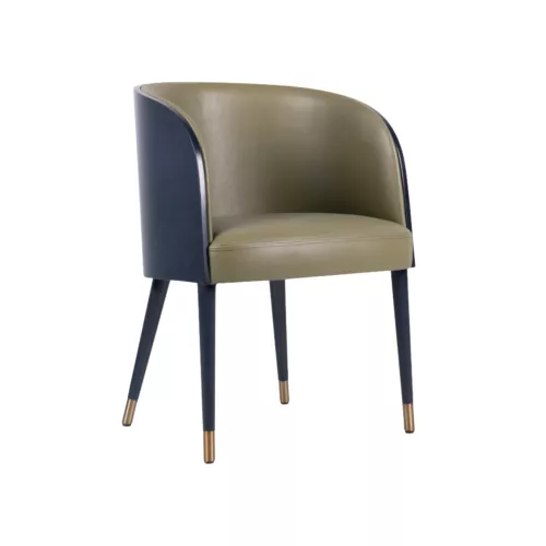 Nibirius A is a chair with armrests featuring smooth, flowing lines that create a welcoming atmosphere. Crafted from durable beechwood with multiple stain options, it includes elegant golden caps on the legs. Upholstered in a wide selection of professional fabrics or faux leather, it is designed to endure heavy use while fitting various horeca interiors and styles.