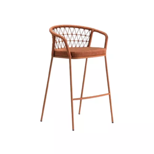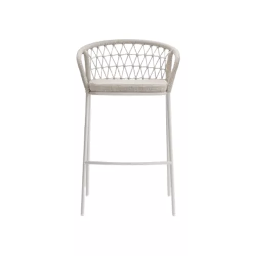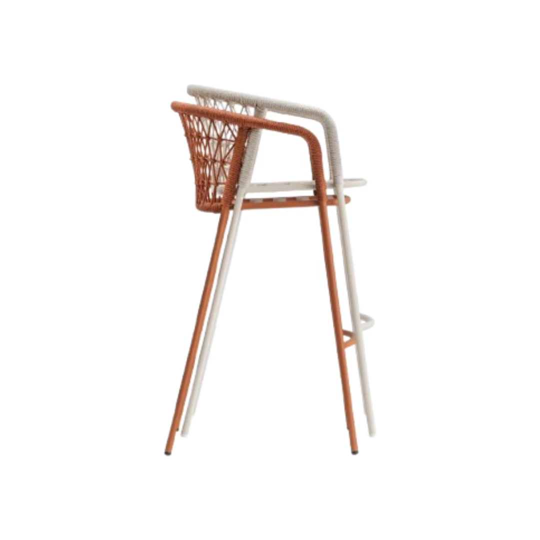 Panarea 3678 is een stijlvolle barkruk met een stalen buisframe van Ø20 mm, omwikkeld met handgeweven Italiaans polypropyleenkoord. Het zitkussen van droog aanvoelend polyurethaanschuim en bijpassende stof biedt comfort en duurzaamheid, waardoor hij perfect is voor terrassen, spa's, bistro's en restaurants.