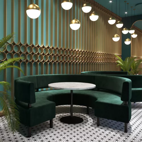 De Rado Halfronde Bank is speciaal ontworpen voor restaurants, bistro’s en cafés die op zoek zijn naar sfeer en comfort. Met zijn elegante, gebogen vorm creëert Rado gezellige en stijlvolle zitopstellingen die uitnodigen tot contact en ontspanning. Ideaal voor hoeken, middenopstellingen of tegen de wand. De bank is bekleed met hoogwaardige stoffen en rust op een stevig beukenhouten frame. Kies voor Rado om jouw horecazaak een warme, professionele uitstraling te geven.