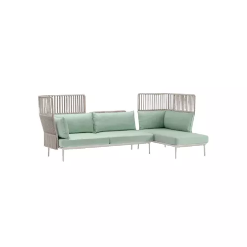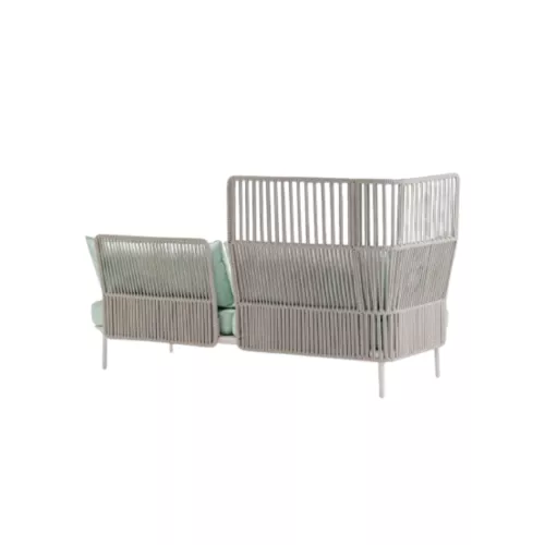 De Reva Cocoon RVC025/026 heeft een geëxtrudeerd aluminium frame op vier gegoten poten en roestvrijstalen rugleuningen omwikkeld met geweven polypropyleenkoord. De kussens zijn voorzien van een waterdichte beschermhoes en stoffen bekleding, wat zorgt voor verfijnd comfort op terrassen, in lounges en restaurants. Dankzij het modulaire systeem zijn er meerdere configuraties mogelijk, geschikt voor diverse omgevingen.