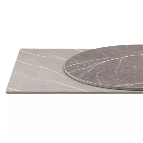Massieve laminaatbladen, vervaardigd door het persen van meerdere papierlagen geïmpregneerd met thermohardende harsen, bieden uitstekende functionele en esthetische eigenschappen. Bladen met steenlook zijn verkrijgbaar in verschillende vormen en maten. Dikte: 10 mm.