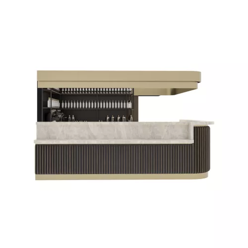Het gehele corpus is afgewerkt in donker antraciet melamine, waardoor de bar een ingetogen, eigentijdse verfijning heeft die goed past bij de messing- en houtelementen.