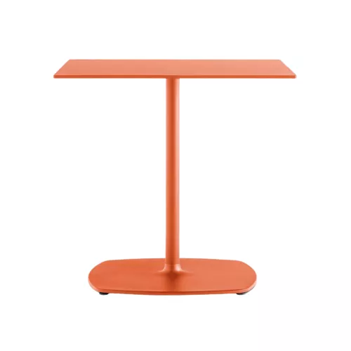 Table base with rounded corners made of sandblasted cast iron, paired with a tubular steel column.