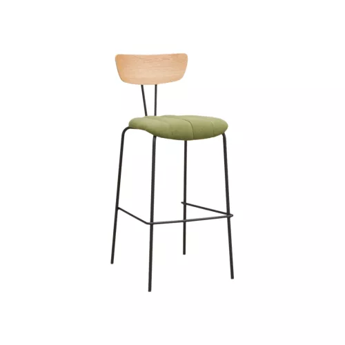 Summer BK is een stijlvolle barkruk met een stevig stalen frame, gestoffeerde zitting en houten rugleuning. De stoffering is beschikbaar in diverse professionele, slijtvast stoffen. Met een metalen voetsteun is deze barkruk perfect voor bars en andere horecalocaties.