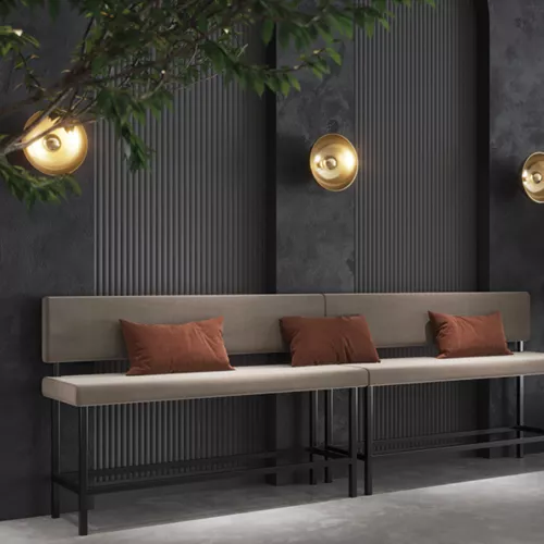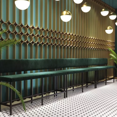 The Arthur bench is a high diner bench with a metal frame, designed for gastronomy use. It is available in various colors and finishes and can be customized to your preferred dimensions. This modular upholstered bench comes in variable sizes and can be made in a wide range of fabrics and artificial leathers. Seat depth: 39 cm. Price per meter.