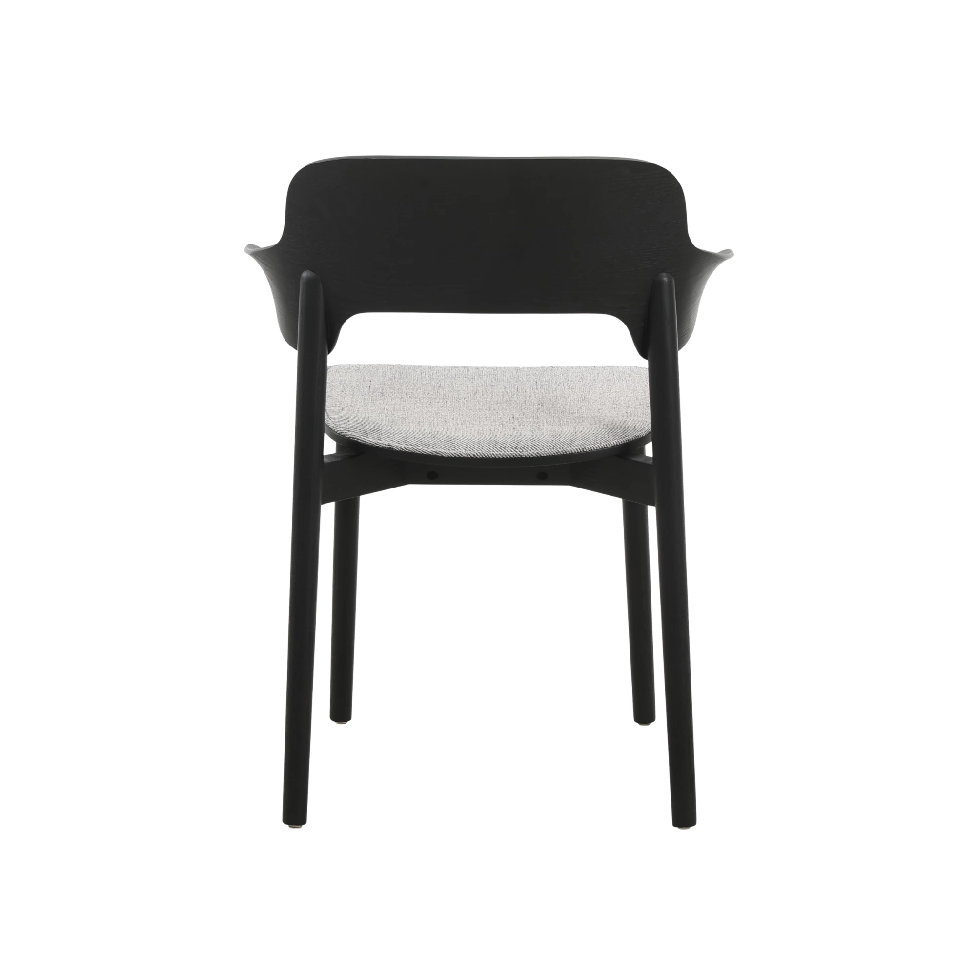 Contemporary oak chair with armrests and upholstered seat for added comfort. Crafted from solid wood, it suits elegant HoReCa environments. Available in multiple wood finishes and customizable fabrics.