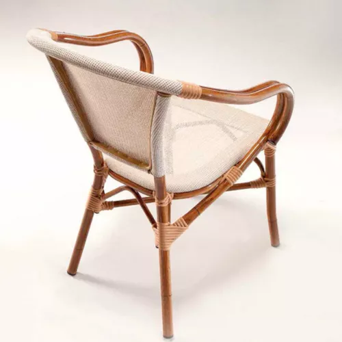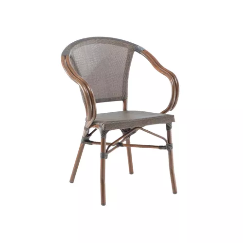 Bertha A is a stylish and practical stackable outdoor chair with armrests, perfect for horeca terraces. It features a lightweight Aluminium frame with a wood-look finish and a seat and backrest in durable, weather-resistant textilene. Versatile in design, Bertha A suits various outdoor settings and complements many interior design styles.