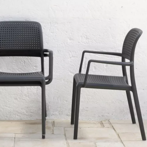 Bora is a durable and lightweight outdoor chair made of recyclable polypropylene with UV additives. The monobloc structure and armrests ensure stability and comfort. Stackable and available in multiple colors, it’s ideal for horeca terraces and other exterior spaces. A practical solution that combines design, strength, and functionality.