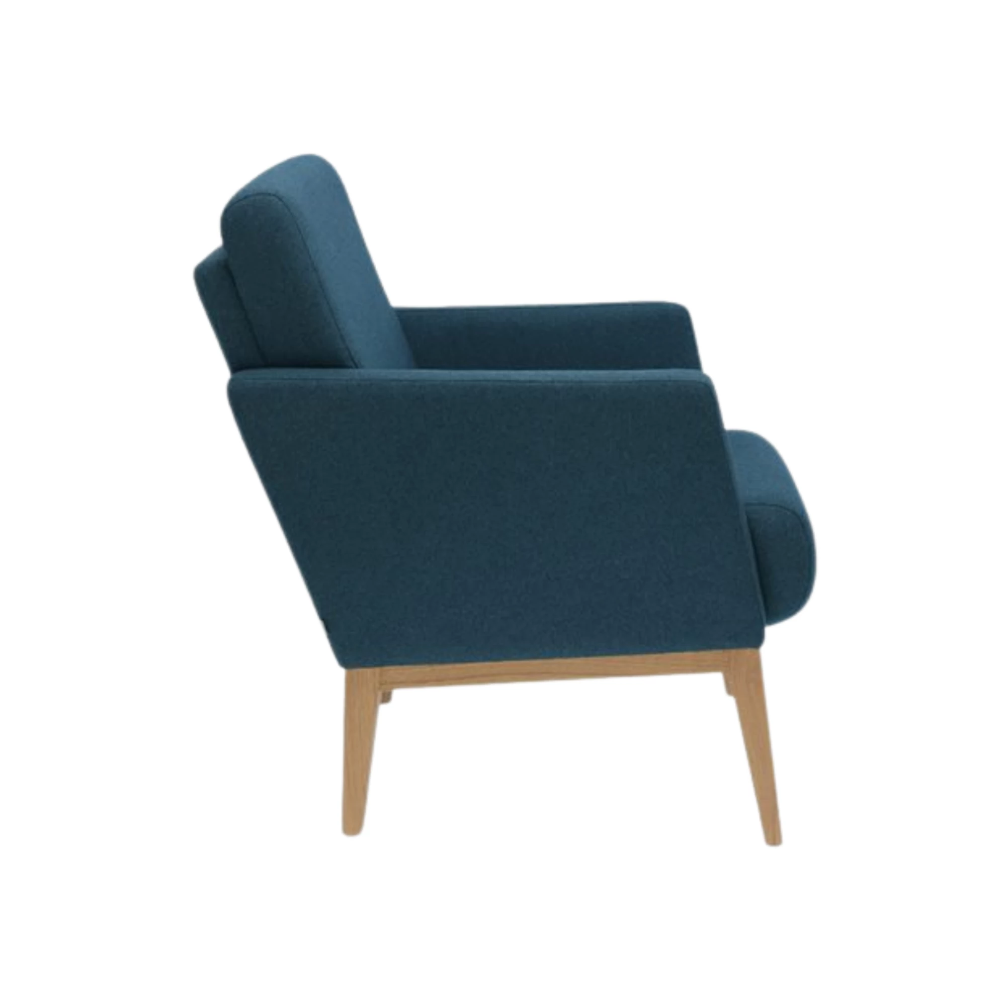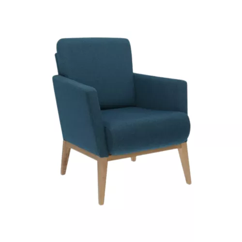 The Bowen armchair features sturdy beech wood legs and is fully upholstered on the seat, backrest, and armrests, ensuring maximum comfort. Customizable with a wide selection of professional fabrics or faux leather designed for intense use, plus multiple wood stain options. Perfect for lounges, lobbies, and various horeca settings, combining style and durability.