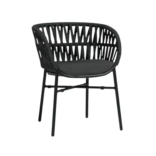 Stackable terrace chair designed for outdoor use. Frame: powder-coated aluminium in anthracite color. Seat and back: textile with integrated foam. Comes with a grey seat cushion included in the price.