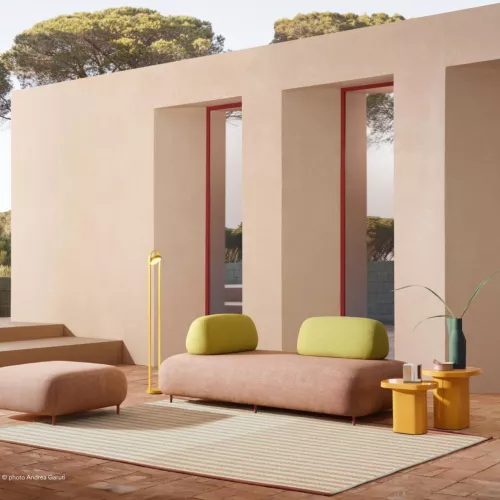Its fully waterproof cover and removable outdoor fabric linings ensure effortless maintenance and lasting performance. With the addition of a movable injected polyurethane foam backrest, featuring a smooth, organic silhouette, the pouf transforms gracefully into a comfortable sofa — adapting fluidly to different spaces and moments.