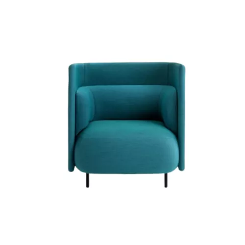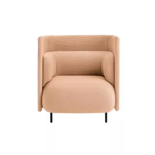Buddyhub BDH001/100 is a one- or two-seater in polyurethane injected foam with elastic belts, complemented by a supportive backrest and armrests and refined aluminium legs. Its wrap-around sound-absorbing panel, available in two heights, creates a quiet, welcoming zone ideal for interior lounge spaces.