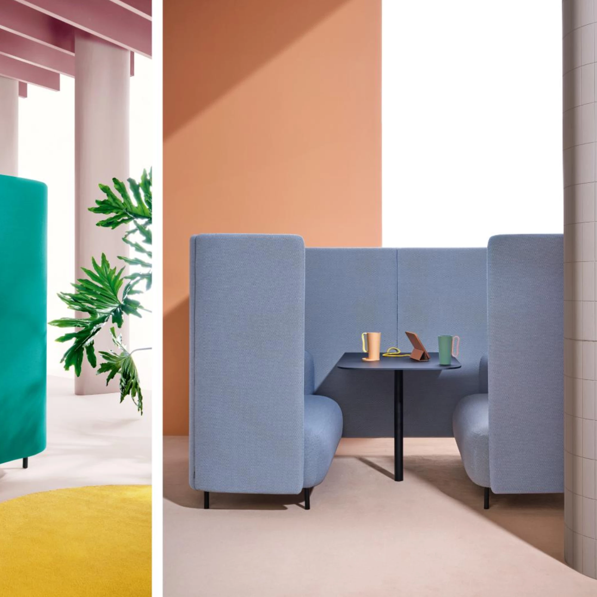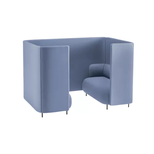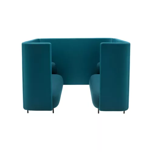 This functional and efficient seating solution creates an isolated alcove that offers both acoustic and visual privacy, perfectly aligned with contemporary office trends. A wrap-around, sound-absorbing panel gently envelops the seating area, forming an inviting enclosed niche ideal for focused work, relaxed conversation or moments of quiet. Two units can be positioned opposite each other and connected with a central panel, transforming the composition into an informal meeting point or breakout area. The four-seat box is crafted with injected polyurethane foam supported by elastic belts, with backrest and armrests in the same high-resilience foam, all set on a durable steel frame and refined aluminium legs.
