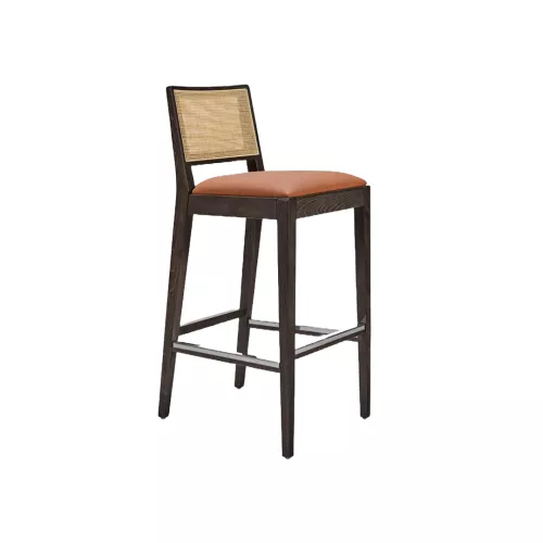 The Cassie BK Straw barstool combines natural warmth with refined comfort. Its beech wood frame, available in multiple stain finishes, features a wooden footrest with metal protection for durability. The upholstered seat and elegant cane backrest create a sophisticated look, ideal for bars, cafés, and other horeca spaces.