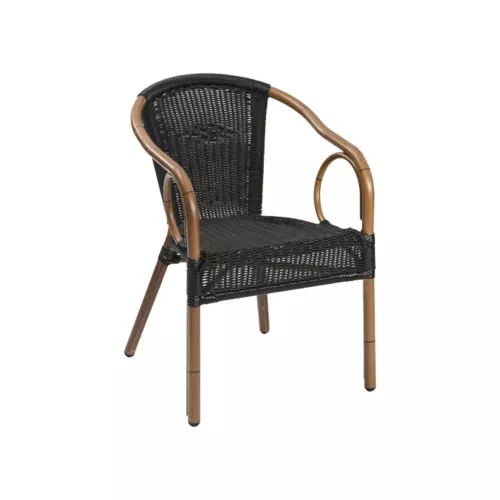 Corino is a stylish outdoor chair with armrests, featuring a powder-coated aluminium frame with a bamboo look. The seat and backrest are made of round P.E. wicker, available in black or honey. UV- and weather-resistant, Corino is built for durability in horeca settings. Stackable up to 8 pieces, it combines elegance, comfort, and space-saving functionality.