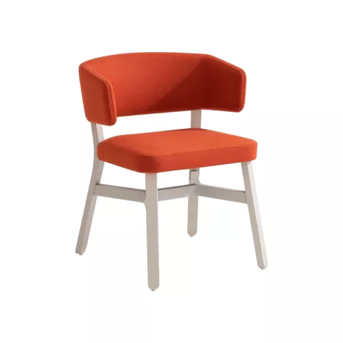 Croissant 571 is an elegant upholstered chair with a solid beech wood frame, designed for lasting comfort and visual appeal. The curved backrest offers ergonomic support, while the padded seat ensures a pleasant seating experience. Available in multiple wood stain finishes and a wide selection of professional fabrics for personalized upholstery.