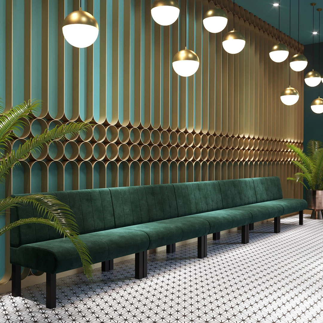 This dining bench is designed to suit a wide range of hospitality interiors, thanks to its customizable length and upholstery options. Built to meet specific spatial needs, it offers comfort and versatility. You can select from a broad range of professional fabrics or synthetic leather, or personalize it further by providing your own fabric.