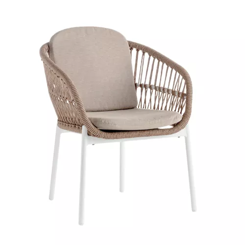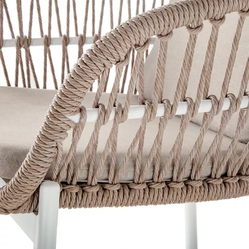 Burl is a modern outdoor chair with armrests, crafted from durable Aluminium and elegantly wrapped in Wintech synthetic rope. The removable Olefin fabric cushions ensure comfort and weather resistance. Ideal for any HoReCa terrace or stylish outdoor setting.