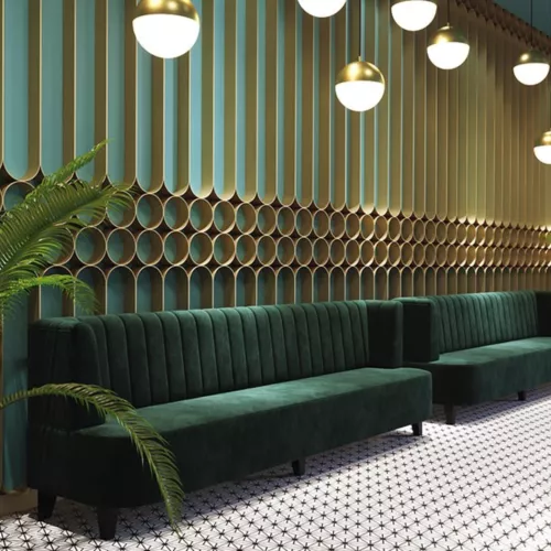 Faith Sofa is a stylish restaurant bench featuring high-density foam for enhanced comfort and long-lasting resilience. It is available in a wide selection of professional-grade fabrics or synthetic leather. The bench can also be customized with your own fabric and tailored entirely to your specifications. The price includes a black or standard melamine base or birch timber legs, with fabric consumption of 3.80 m and 1 m for upholstered back side.