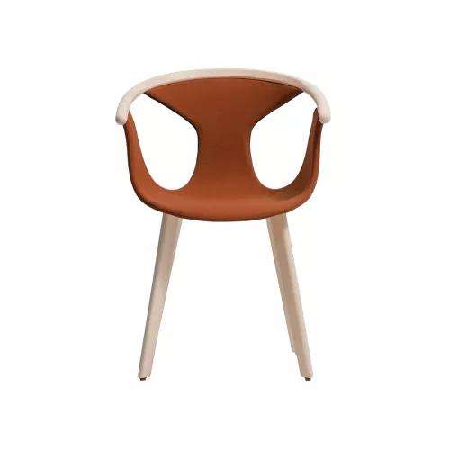 The seat shell is made of polypropylene, padded with flexible fire-retardant polyurethane foam (density 60 kg/m³), and upholstered in fabric. It features a gently curved backrest in bent solid ash wood and matching solid ash legs for a cohesive, warm look.