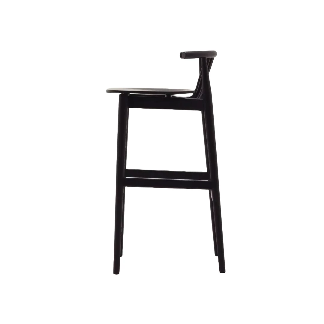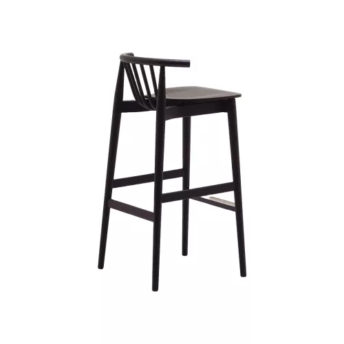 The Groove BK barstool is a modern reinterpretation of mid-century Scandinavian design. Its distinctive curved wooden spindles bring both character and durability. Made from solid ash wood with a stainless steel footrest cover, it blends timeless elegance with modern function. Perfect for bars and horeca spaces, available in multiple stain colors.