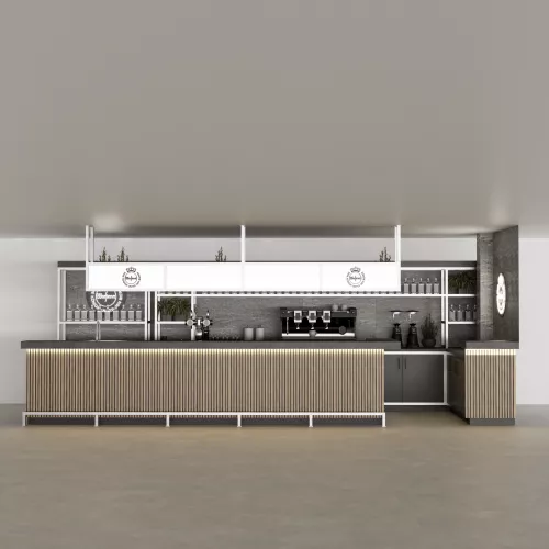 A refined, modern bar concept where natural textures, cool metals, and warm lighting come together in a beautifully balanced composition.