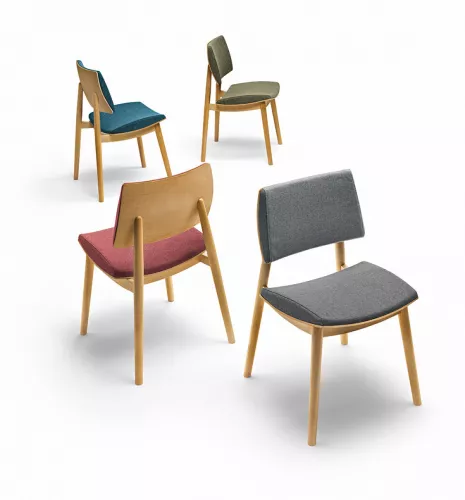 The Japan S chair draws inspiration from traditional woodcraft, combining curved plywood and solid beech turned by hand. With a sturdy beech wood frame and high-density foam, it ensures durability under intensive use. The seat and back are upholstered in fabric, eco-leather, or COM. Wood stains available. Ideal for restaurants, hotels, or cafés.