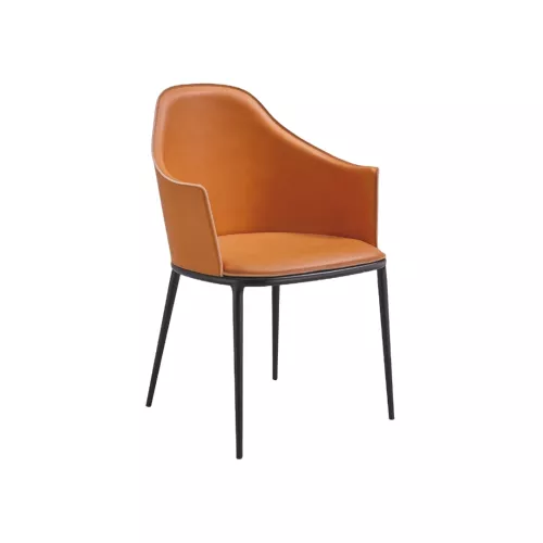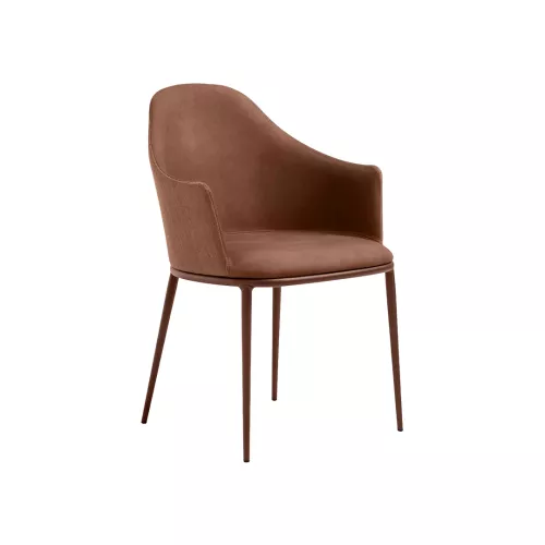 The Lea A chair with armrests combines elegance and comfort with a sturdy four-legged metal base. The seat and backrest are upholstered in fabric, hide, or faux hide, with options to use different materials for front and back. Customizable frame finishes and upholstery make it a versatile choice for modern interiors and professional spaces.