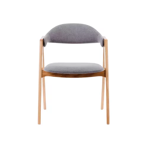 Introduce a blend of modern elegance and comfort to your dining area with this oak frame restaurant chair. The chair features a finely crafted oak wooden frame, ensuring both durability and a natural, warm aesthetic. The seat and backrest are upholstered in a high-quality grey fabric, providing a comfortable and sophisticated seating experience.
