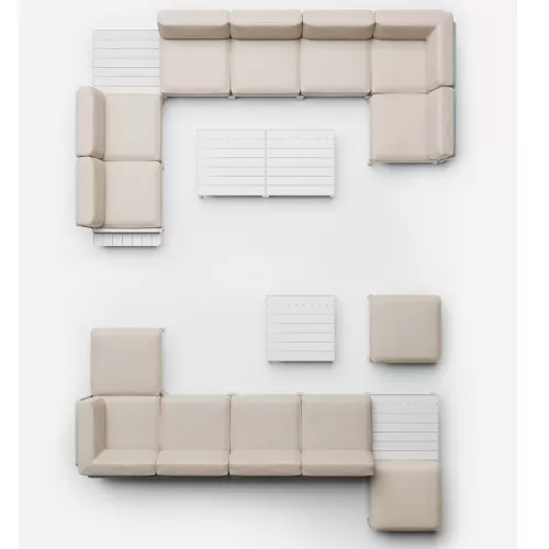 Maximo 5 Sofa is a modular outdoor lounge seating system ideal for horeca settings. Made from UV-protected, regenerated fiberglass polypropylene, the five-seat unit includes eight backrests. The screwless design allows flexible, tool-free configuration. Removable, zippered cushions complete the comfort of this durable and elegant piece.