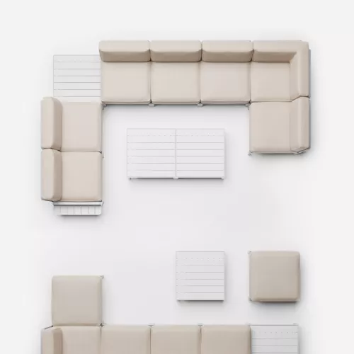 The Maximo Elemento Angolo Sofa is a corner unit from a modular lounge seating system designed for outdoor spaces. Built with a durable, UV-resistant frame made from regenerated fiberglass polypropylene, it features a tool-free connection system that allows backrests and armrests to be attached on any side. The cushioned seat is upholstered with removable zippered covers for added flexibility and easy maintenance. Ideal for horeca outdoor lounges.
