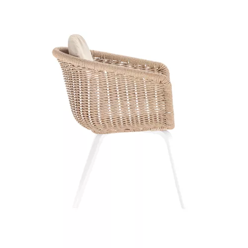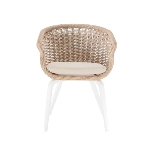 The Mellara outdoor armchair blends durable materials with elegant design. Its aluminium frame is wrapped in weather-resistant Wintech synthetic rope. The removable cushions feature Olefin fabric and quick-dry foam, making it ideal for horeca terraces and diverse design styles.