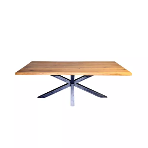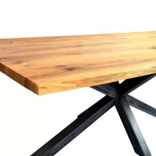 Table with 2.8 cm thick rustic oak top and steel double X-base (8x8 cm).