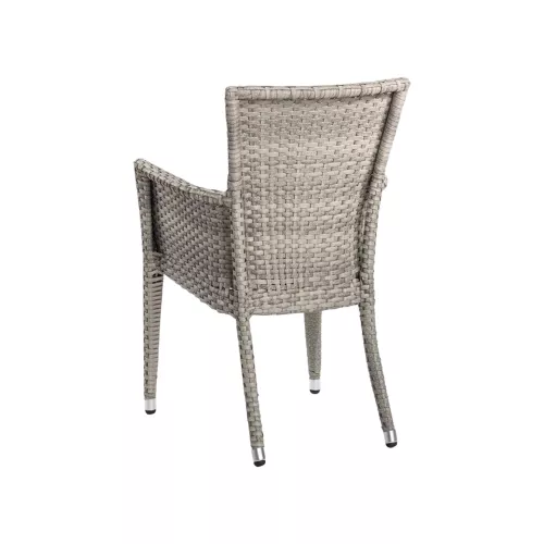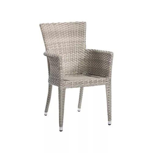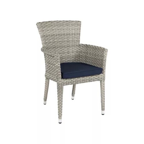 Olga is a durable outdoor chair with armrests, designed for horeca environments. It features a silver matte powder-coated aluminium frame and flat ash-colored P.E. wicker for the seat and backrest. The included navy-blue seat cushion adds comfort. UV- and weather-resistant, stackable up to 6 pieces—perfect for any professional outdoor setting.