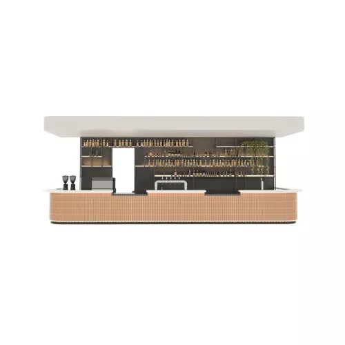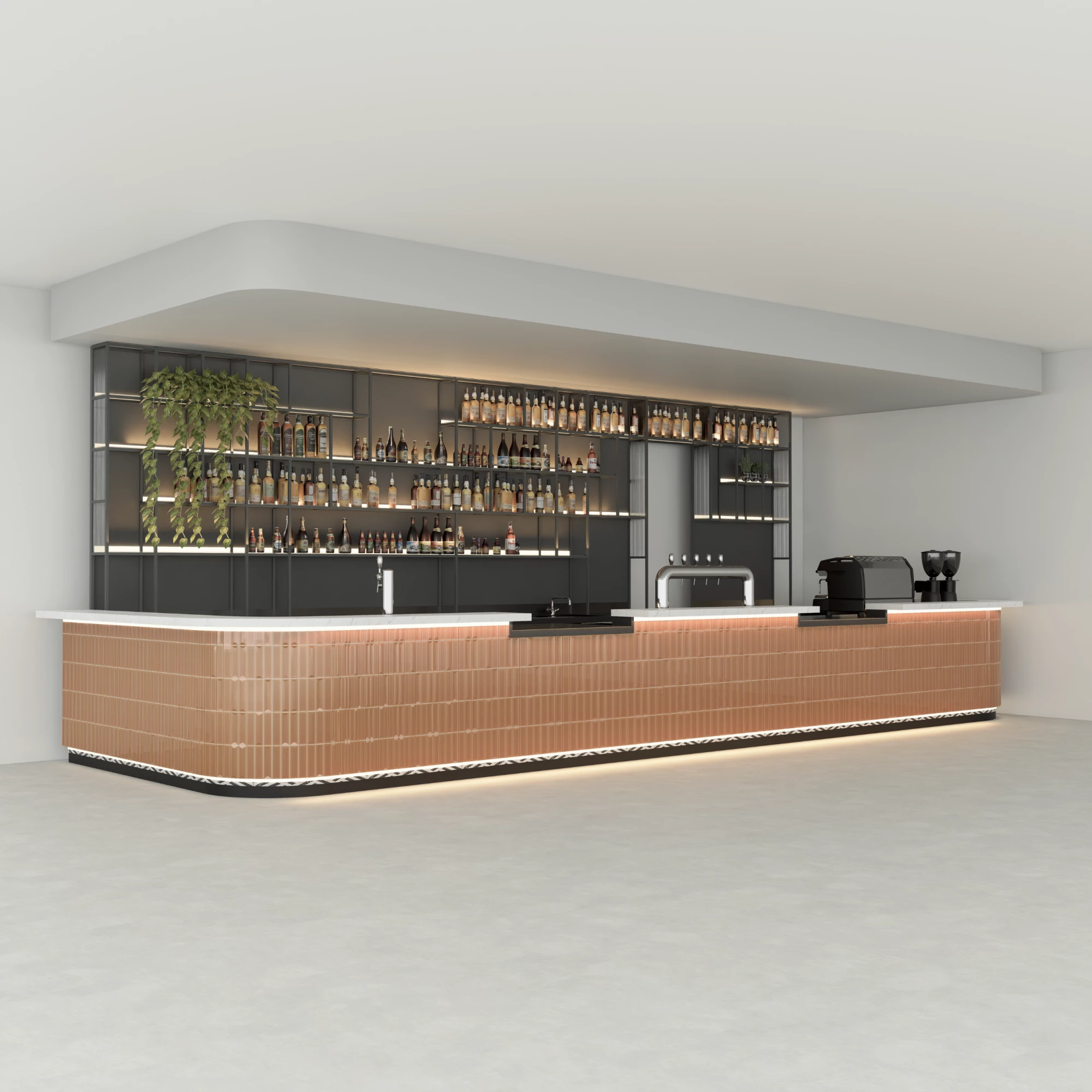 A recessed LED-illuminated plinth adds a floating effect, producing a soft glow that highlights the bar’s structure without overpowering the ambience.