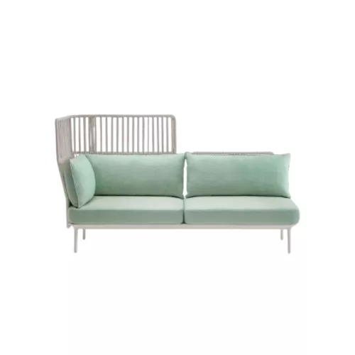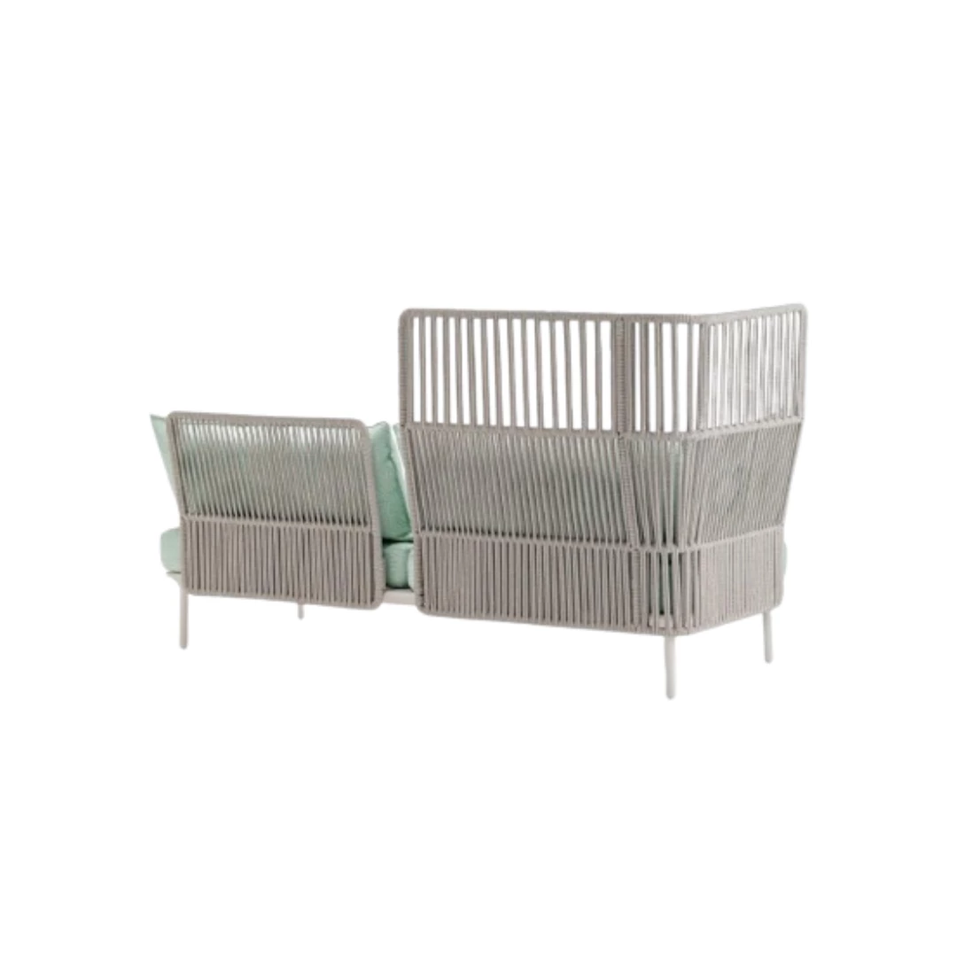 Reva Cocoon RVC025/026 features an extruded aluminium frame on four die-cast legs and stainless steel backrests wrapped in woven polypropylene cord. Its cushions include a waterproof protective cover and fabric upholstery, offering refined comfort for outdoor terraces, lounges, and restaurants. As a modular system, it allows multiple configurations to suit a variety of settings.