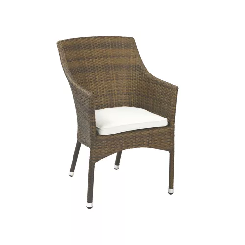 Sady is a versatile outdoor chair crafted for horeca spaces. Its powder-coated aluminum frame and PE-Wicker seat and backrest in roca look provide durability and a natural aesthetic. UV and weather resistant, stackable, and compatible with various design styles. An optional upholstered, water-repellent cushion is also available for added comfort.