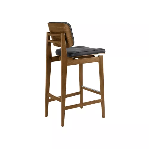 Elegant barstool crafted from durable beech wood, featuring an upholstered seat and backrest for superior comfort. The frame is available in a wide selection of wood stain finishes, allowing seamless coordination with any interior concept. Designed specifically for the Horeca industry, this barstool combines timeless aesthetics with exceptional durability. The upholstery can be customized in faux leather or a wide range of premium fabrics, ensuring long-lasting resistance even under heavy use — making it a reliable and stylish choice for bars, cafés, and restaurants.
