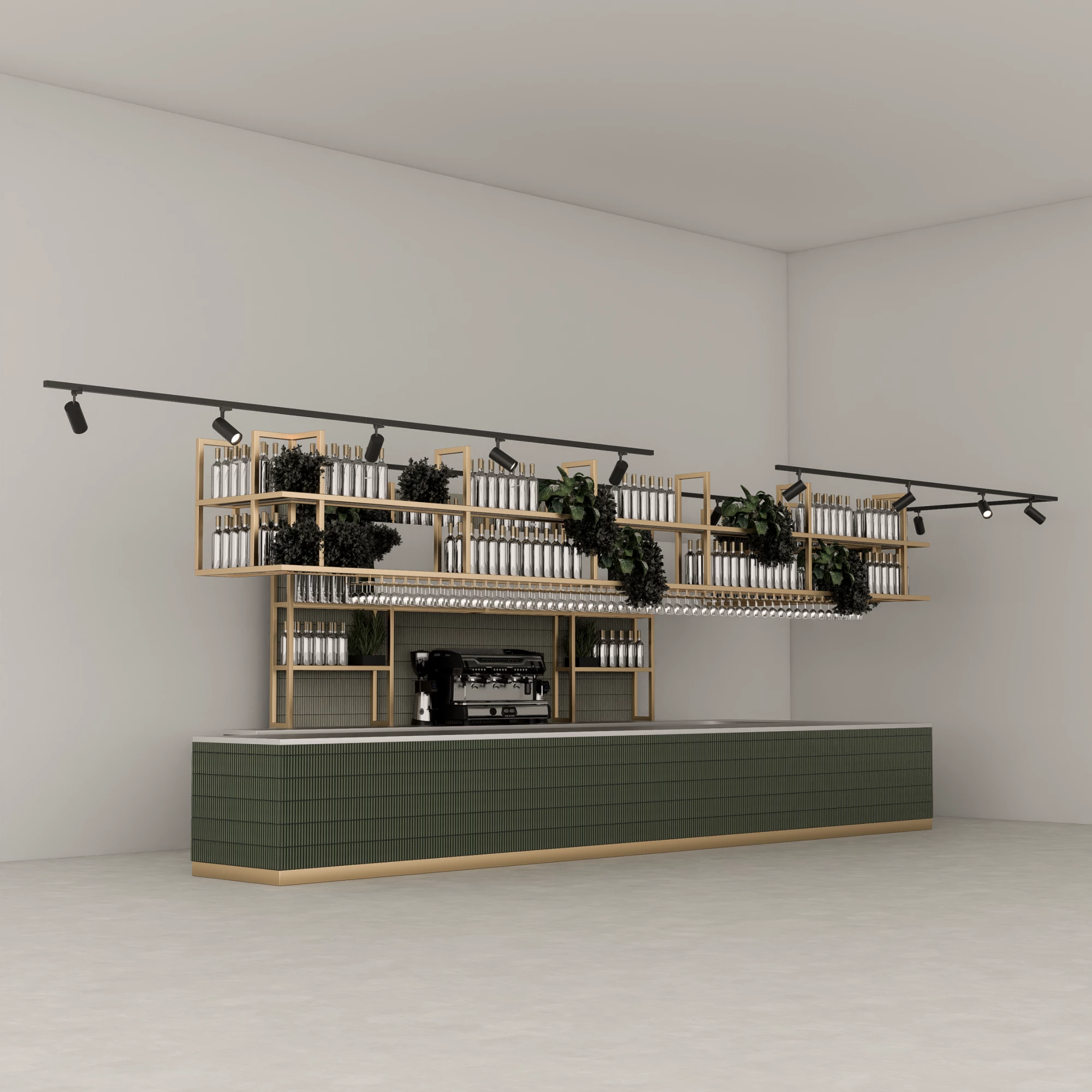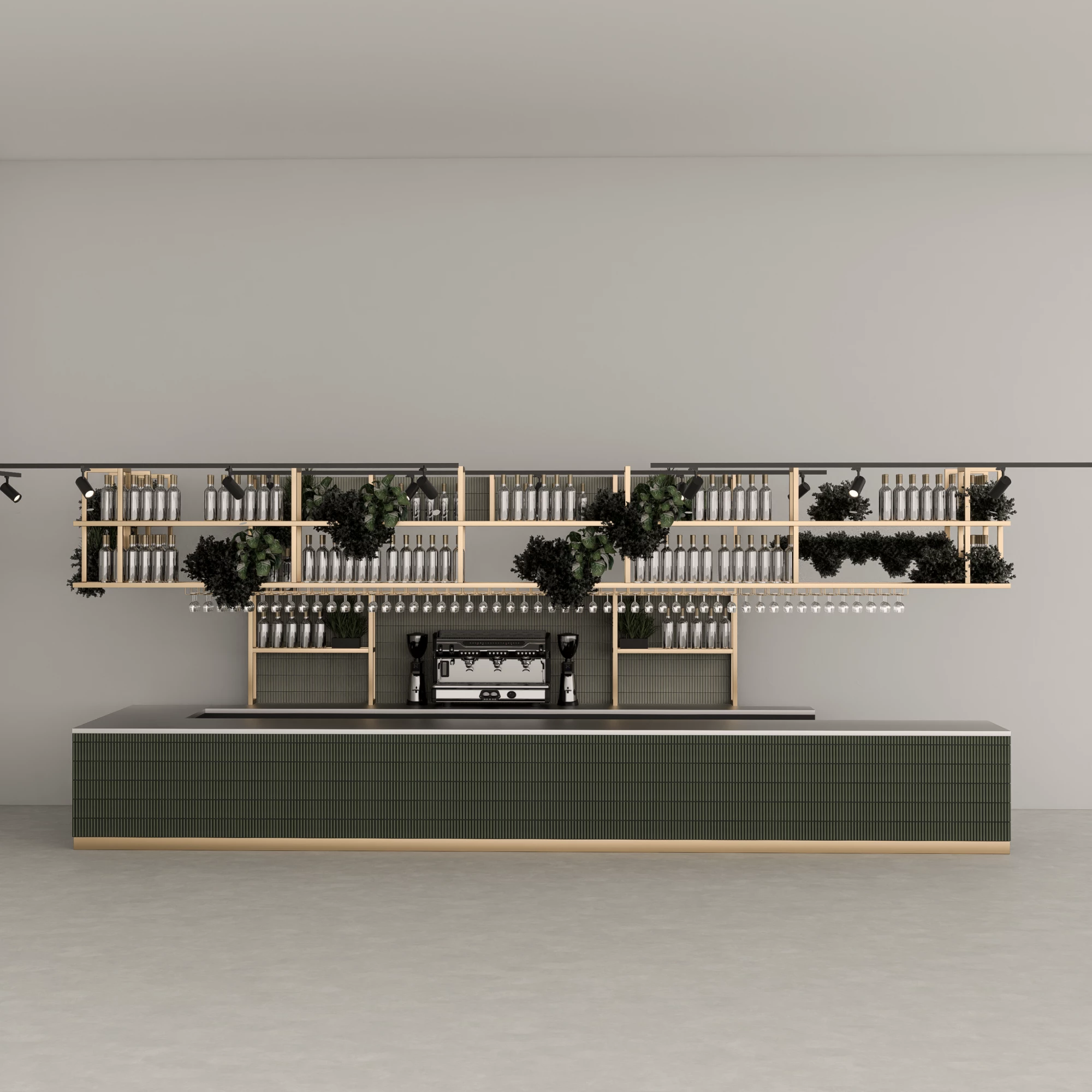 A brushed brass wine glass hanging rack adds both function and golden refinement, echoing the brushed brass of the plinth.