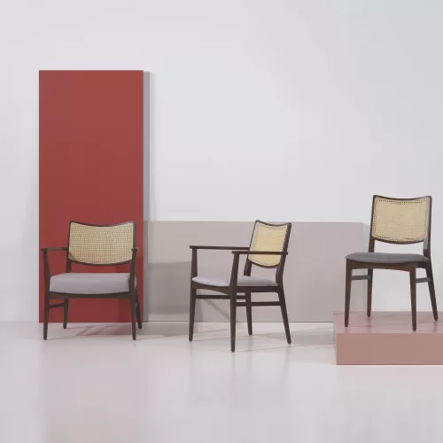 Soul Wicker Lounge is a lounge chair with armrests, designed for horeca interiors that value both comfort and visual appeal. Its beechwood frame, available in multiple stain colors, supports a professionally upholstered seat and a wicker backrest that adds a warm, natural texture. Ideal for refined lounges, lobbies, and hospitality venues with a focus on stylish relaxation.