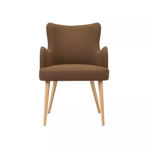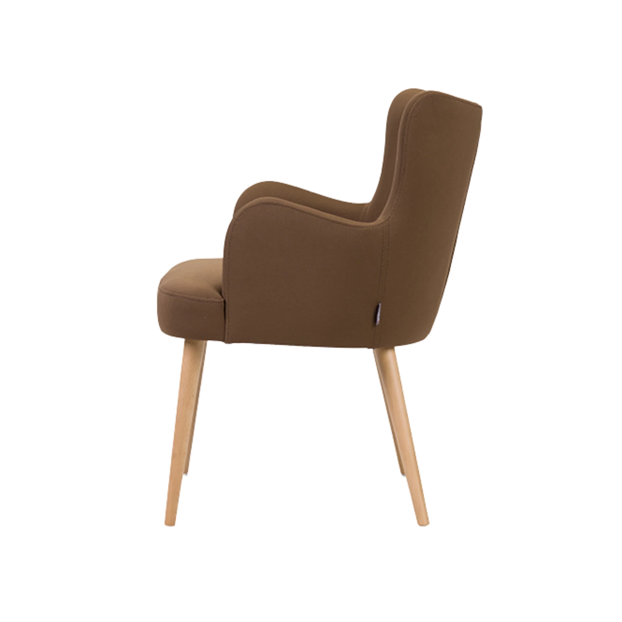 Tavro is a wooden chair with armrests that reflects the elegance of mid-century modern design. Built from solid beech wood in various stain options, it features an upholstered seat and backrest in professional fabrics or faux leather. Designed for horeca spaces, it offers comfort, durability, and seamless integration into diverse interiors.
