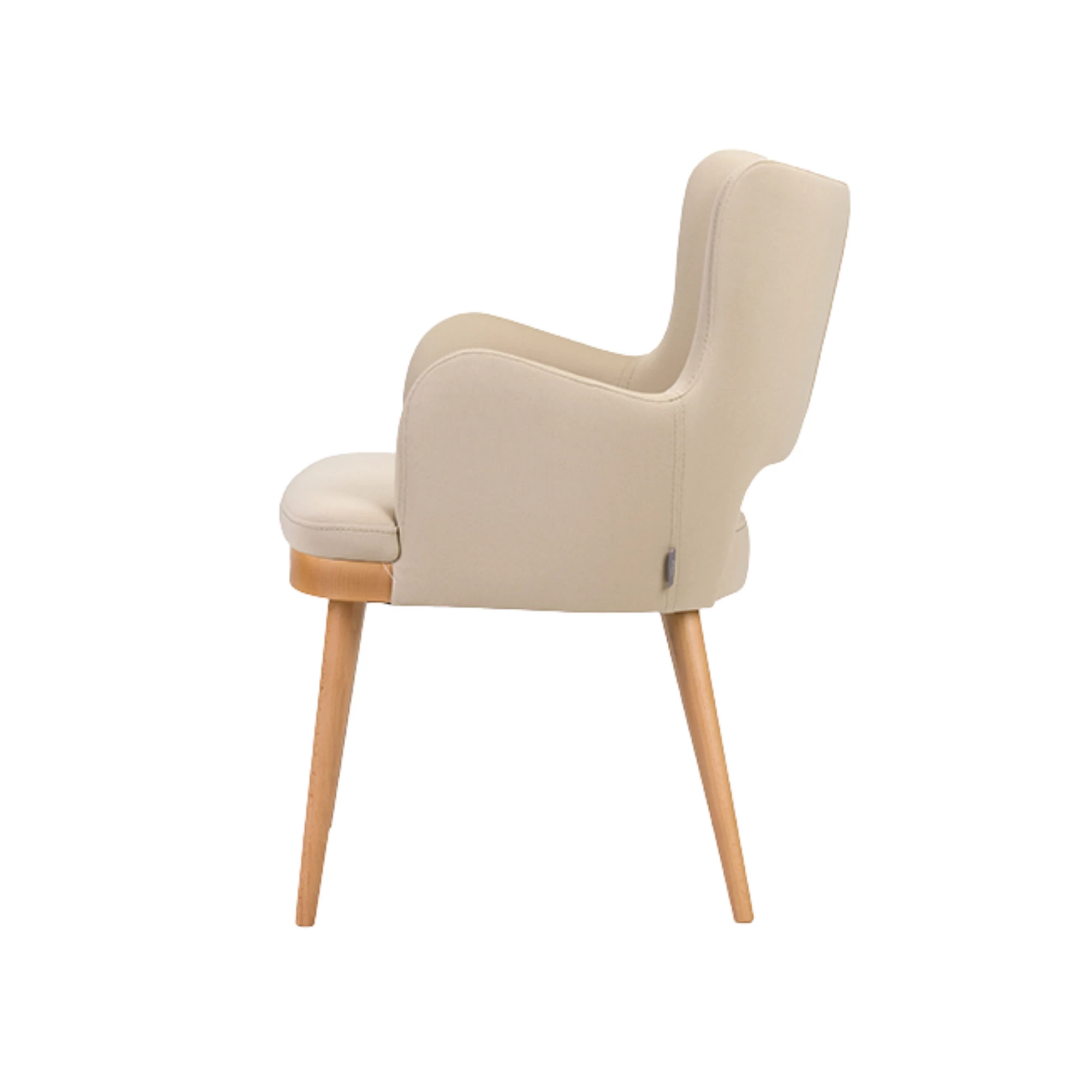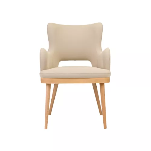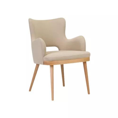 Tavro Hole is a wooden chair with armrests, featuring a distinctive cutout backrest. The beech wood frame, available in various stain colors, pairs with a fully upholstered seat and backrest. Designed for horeca use, it combines mid-century modern elegance with professional-grade comfort and durability for high-traffic environments.