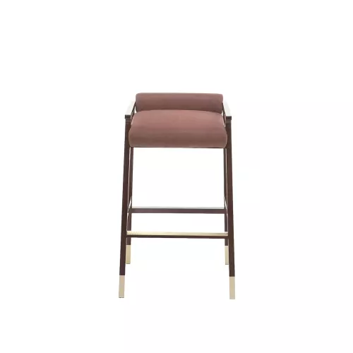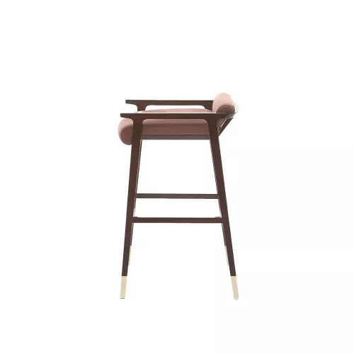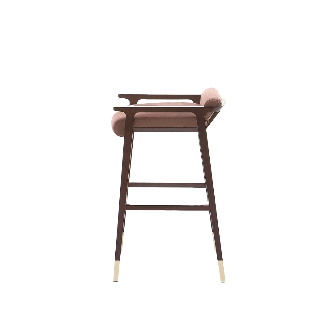 The Tenuo BK wooden barstool combines elegance and sophistication, inspired by 20th-century design masters. Crafted from solid beech wood with brass anodized stainless steel caps and footrest, it features an upholstered seat and backrest available in a wide range of professional fabrics. Perfect for hotels, bars, and horeca spaces.